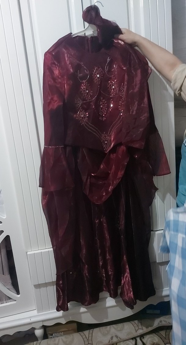 Bordo renkte, askısız ve bol kesimli uzun gece elbisesi. Nakışlı ve katmanlı drapeli gotik tarzda, düğün için uygun. iki göğüs 47 48 uzunluğu 49 50etegin bel kısmı 41 42uzunlugu103 santim iktisat giyilfi