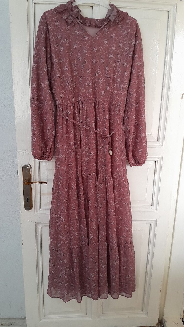 Bordo renkte, uzun kollu, bol kesim ve yüksek yakalı uzun elbise. Belinde bağcıklı, yumuşak sentetik kumaştan, hafif çiçek desenli.
