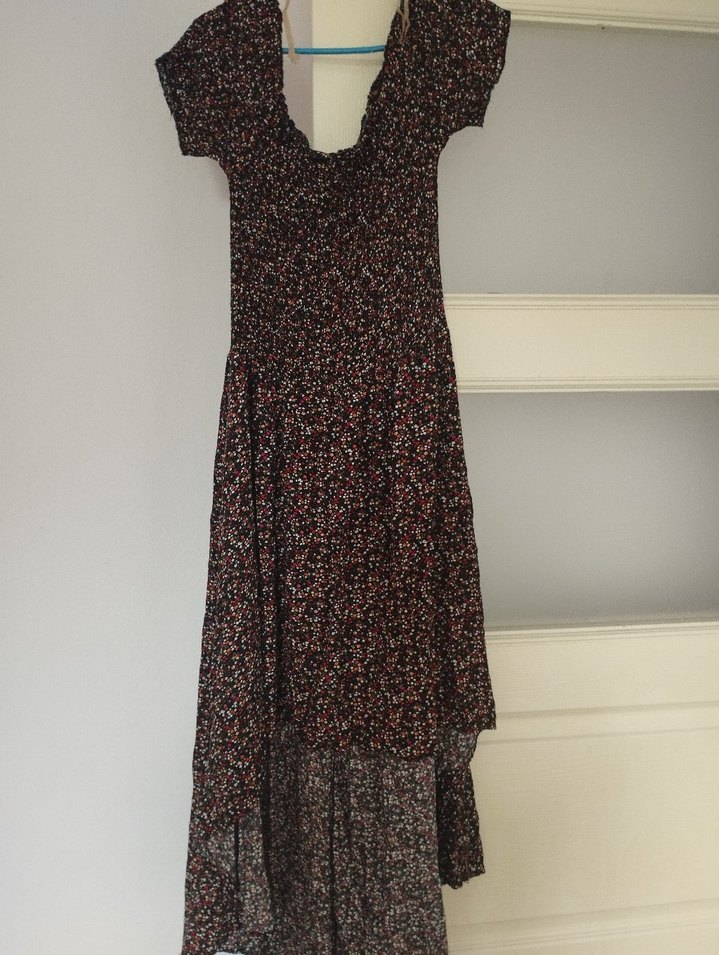 Bordo renkte, drapeli uzun elbise, askılı kollu ve straplez yakalıdır. Bol kesim ve desenli, romantik akşamlar için uygundur.