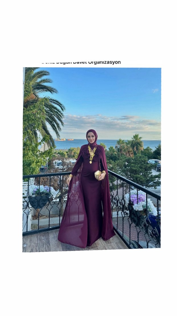 Bordo uzun abiye elbise yüksek yakalı ve uzun kollu, etnik desenlidir. Mütevazı, regular fit ve drapeli tasarımıyla düğünler için uygundur. Bohem tarzı şıklık katar. Üzerinde 'vrganizasyon' yazısı bulunur. Etikeylı sıfır