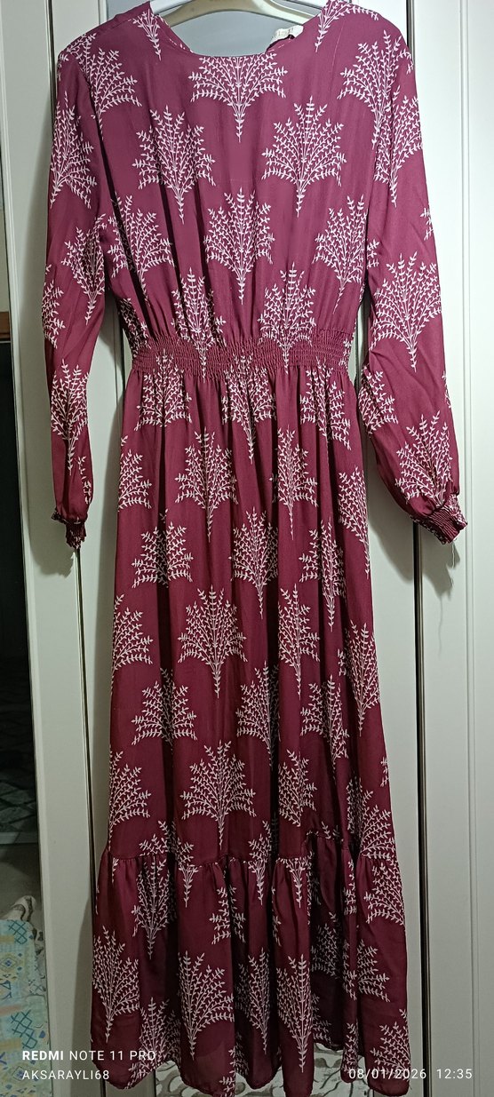 Bordo renkli, uzun kollu, bol kesim bohem tarzda kadın elbisesi. Sentetik kumaştan, fırfır detaylı ve batik desenlidir. Askısız yaka ile retro bir hava sunar.