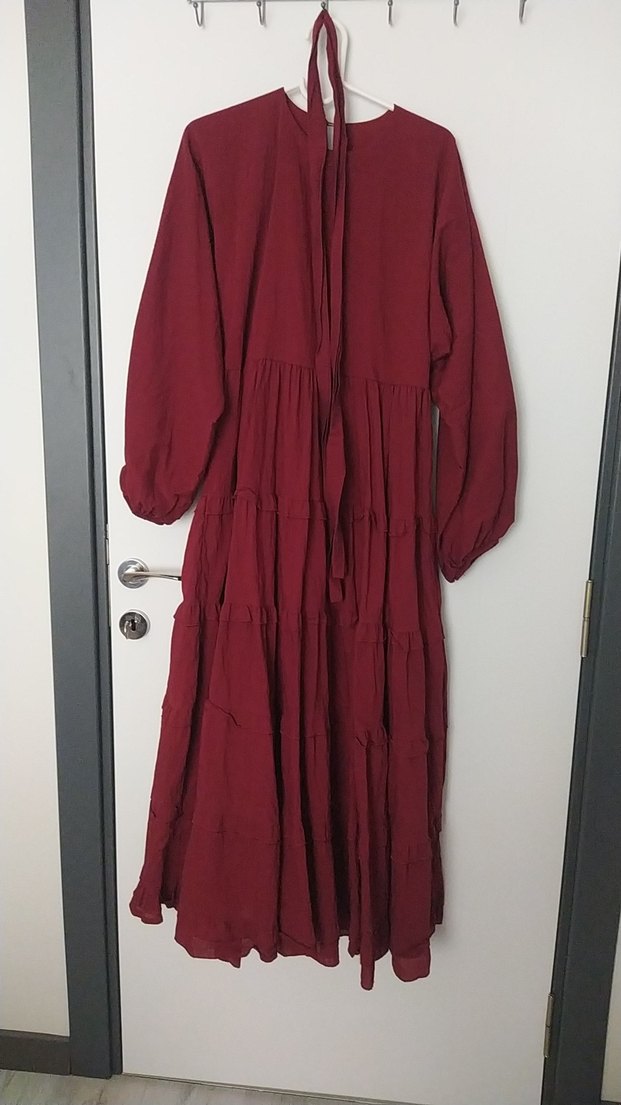 Bordo renkli, keten kumaştan yapılmış uzun pilili elbise. Yüksek yakalı, salaş kesim ve ince askılıdır. Bohem tarzda, günlük kullanıma uygundur.