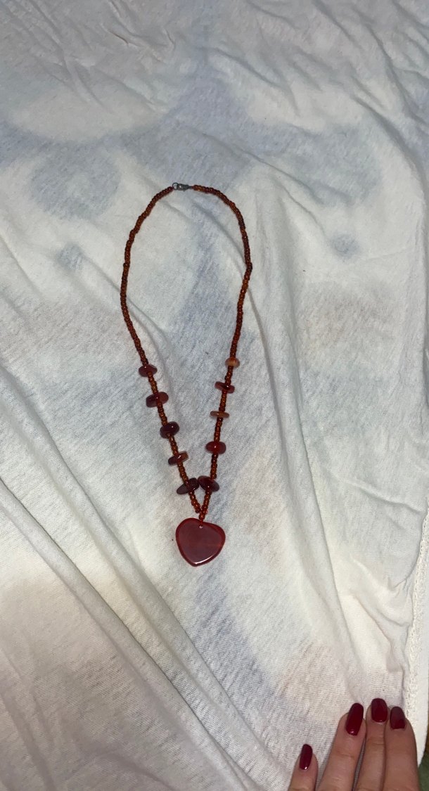 Bordo renkli, uzun boncuklu ve nakış desenli kolye. Kalp şeklinde kolye ucu ile bohem tarzı günlük kullanım için uygundur. ❤️