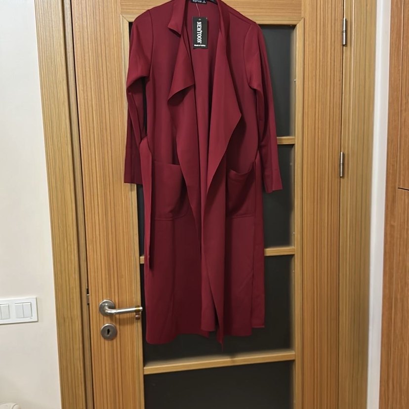 Bordo renkli, uzun süet ceket; notalı yaka ve dökümlü ön detaylara sahiptir. Uzun kollu ve regular fit, minimalist sokak stiline uygundur. marka temsili