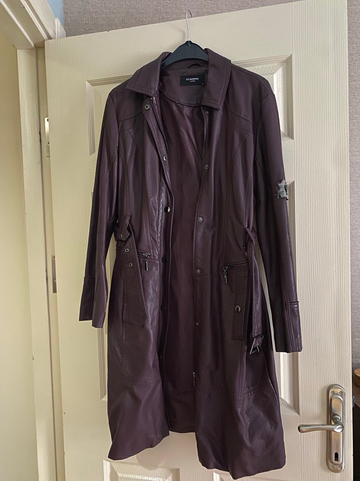 Yıpranan kısımları çektim. Bordo uzun deri ceket, kesik yaka ve kemerli bel detayıyla sokak stiline uygun. Regular fit ve uzun kollu, fermuarlı ceplidir.