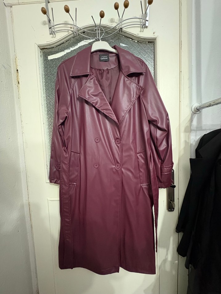 Bordo uzun deri trençkot, kesik yaka ve düğmeli ön detaylara sahiptir. Kayışlı kolları ve rahat kesimiyle sokak stiline uygundur.