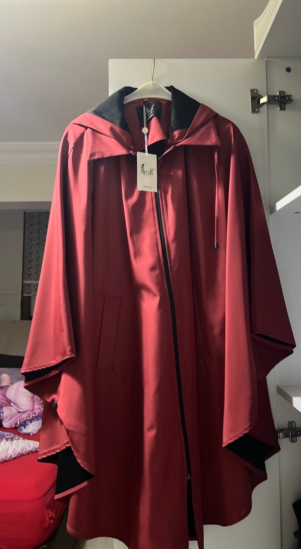 Bordo uzun yağmurluk, dökümlü ve bol kesimli tasarımıyla parlak ve satenimsi kumaştan üretilmiştir. Uzun kollu ve kırlangıç yaka ile goth tarzını yansıtır. Yeni etiketli