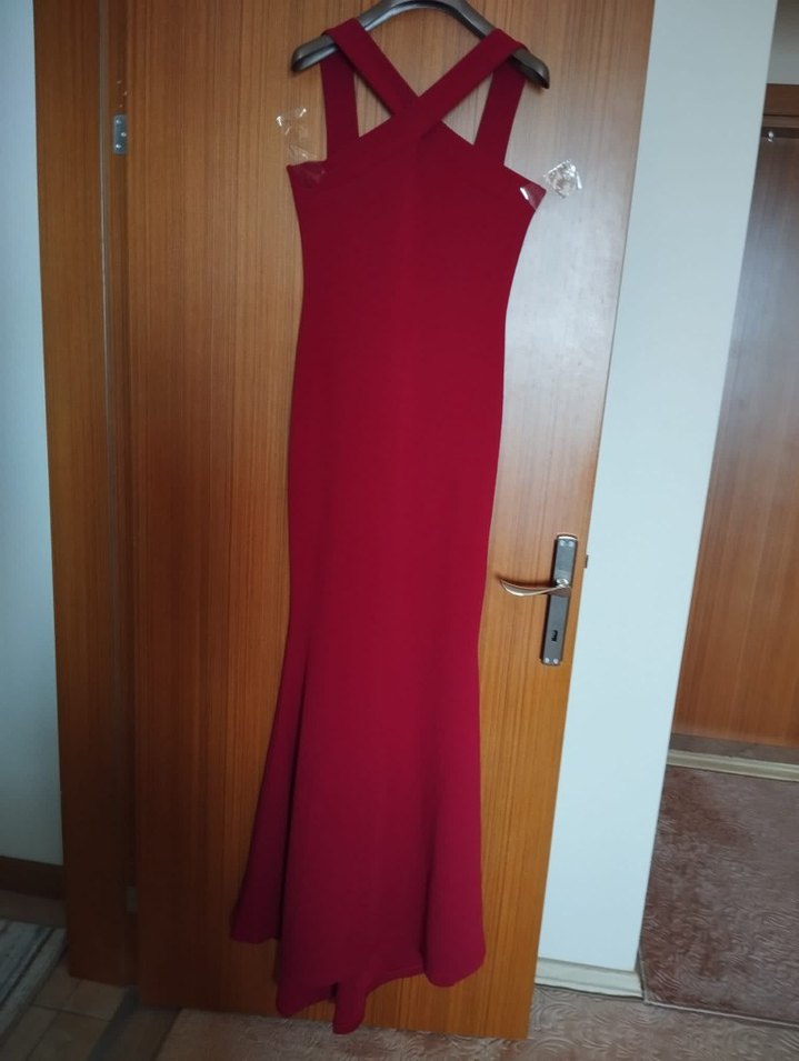 Bordo renk, uzun boy, drapeli ve parlak kumaşlı abiye elbise. Straplez olup modern klasik ve minimalist tarzda, düğün için uygun.