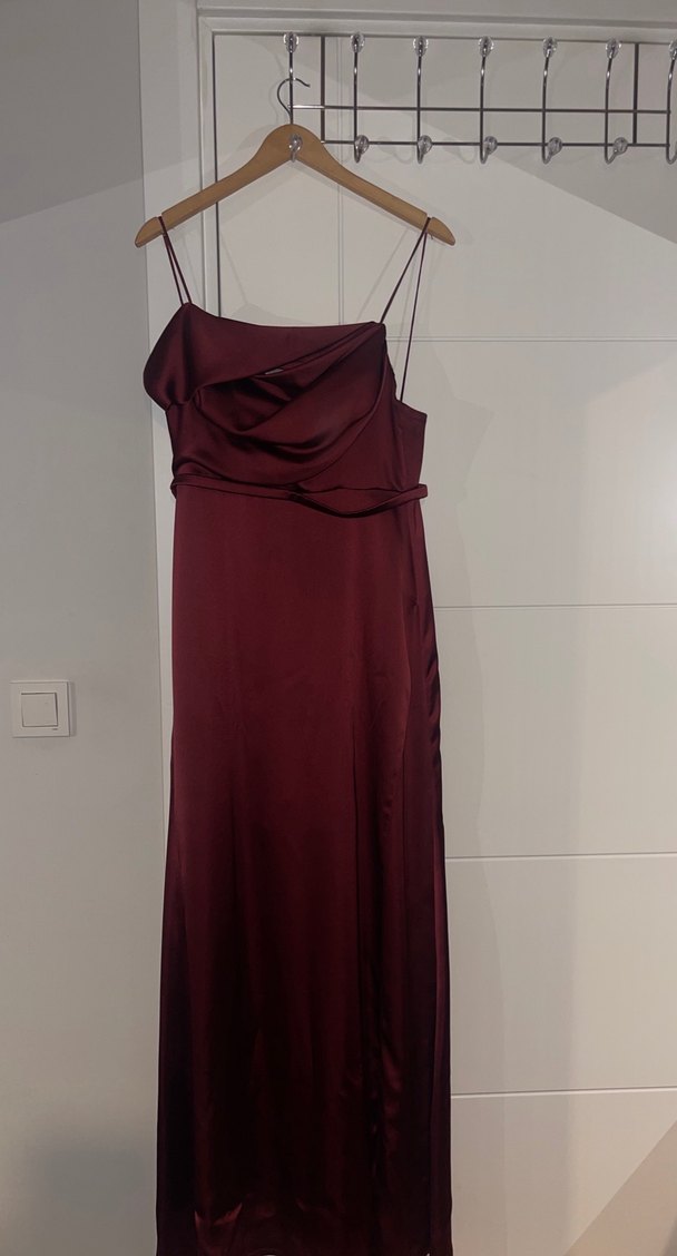 Bordo renkli, drapeli detaylara sahip, askılı ve straplez yaka uzun abiye elbise. Minimalist ve modern tarzda, romantik akşamlar için uygundur.