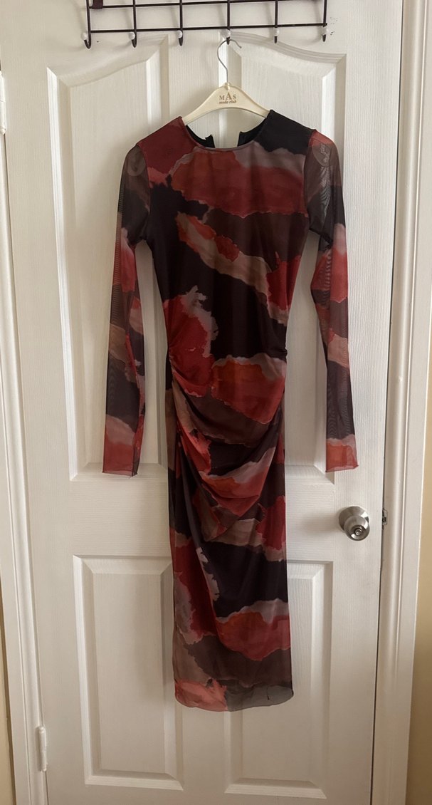 Bordo renkli, uzun kollu ve yüksek yakalı bu kadın elbisesi, bağlama desenli ve vücuda oturan kesimi ile dikkat çeker. Sentetik kumaştan, drapeli tasarımı romantik akşamlar için uygundur.