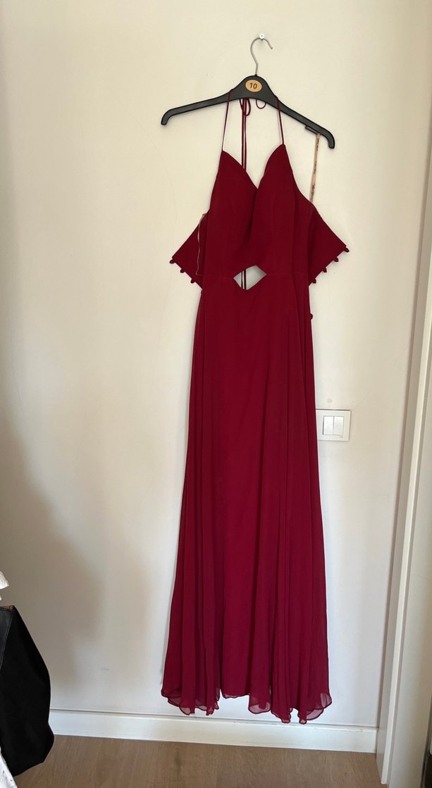 Bordo uzun, drapeli ve V yakalı, ince kesim bohem tarzda Abiye ve gece elbisesi. Askılı kolları ve desensiz yapısıyla şık bir seçenek.