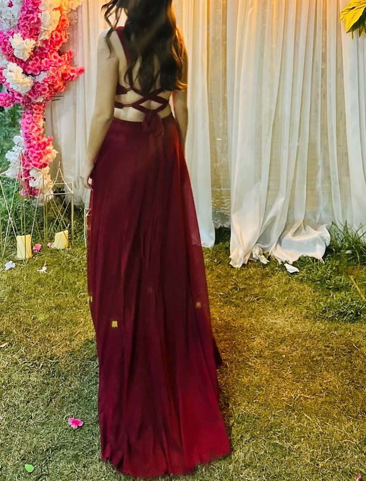 Bordo uzun, drapeli ve sırtı ince askılı, V yaka kadın abiye elbise. Parlak kumaşı ve bohem tarzıyla düğünlere uygun.