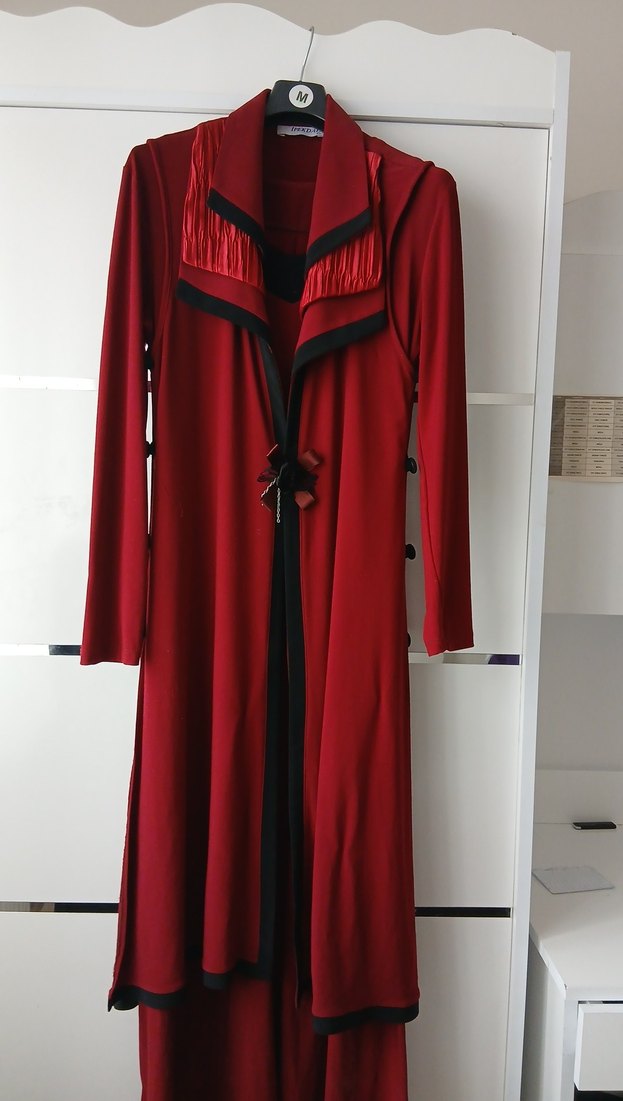Bordo renkte, uzun ve drapeli yakalı, ince kesimli, ipeksi dokulu gotik tarzda Elbise. Ofis kullanımı için uygun.