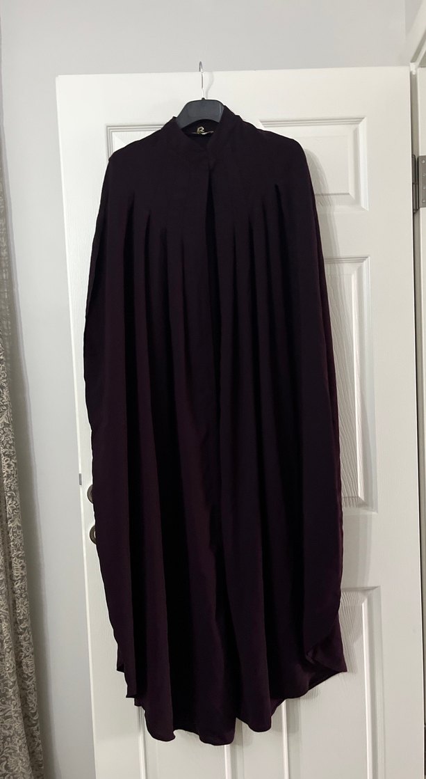 Bordo renginde, uzun kollu, yüksek yakalı, bol ve drapeli kesime sahip gotik tarzda kadın mezuniyet elbisesi. Desensiz ve modest tasarımla ofis ortamına uygundur.