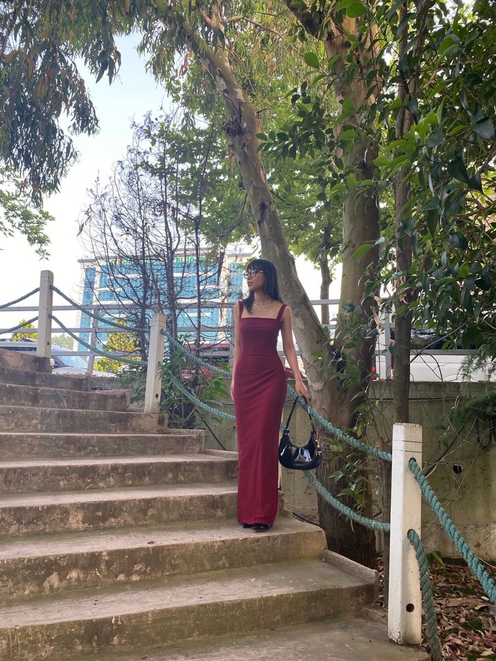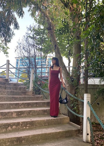 Bordo Uzun Drapeli İnce Askılı Elbise