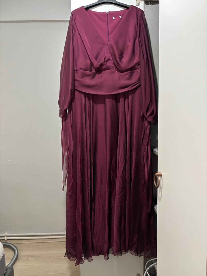 Bordo uzun abiye elbise, bol kesim ve drapeli detaylara sahiptir. V yaka ve askılı kolludur. Moda ve avangart gotik tarzını yansıtır. yalnızca bir kez kullanıldı