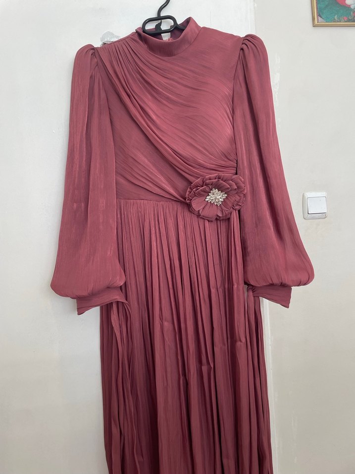 Bordo renkli, yüksek yakalı, uzun kollu ve bol kesim kadın abiye elbise. Drapeli detaylar ve belde çiçek süsü bulunur. Modern klasik tarzda, düğün için uygun. Pazarlık payı vardır