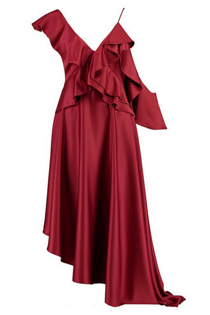 Bordo, parlak desenli kumaştan, drapeli ve bol kesim uzun abiye elbise. İnce askılı ve V yakalı, romantik akşamlar için ideal.