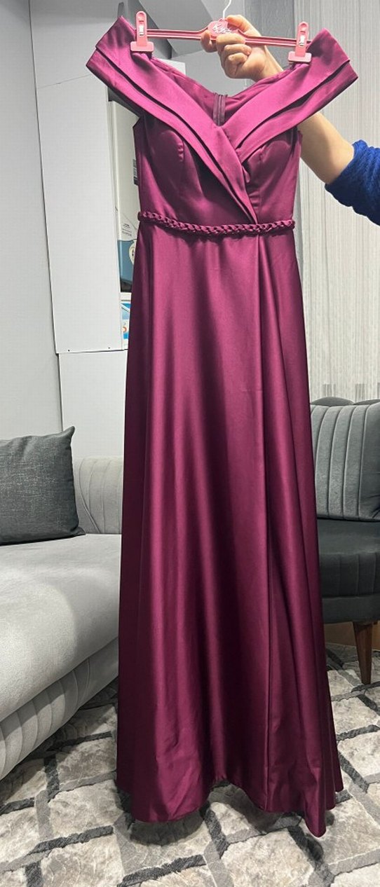Bordo renk, parlak kumaş ve drapeli tasarıma sahip uzun abiye elbise. Kayık yaka ve ince askılarla sade ve modern klasik bir görünüm sunar.