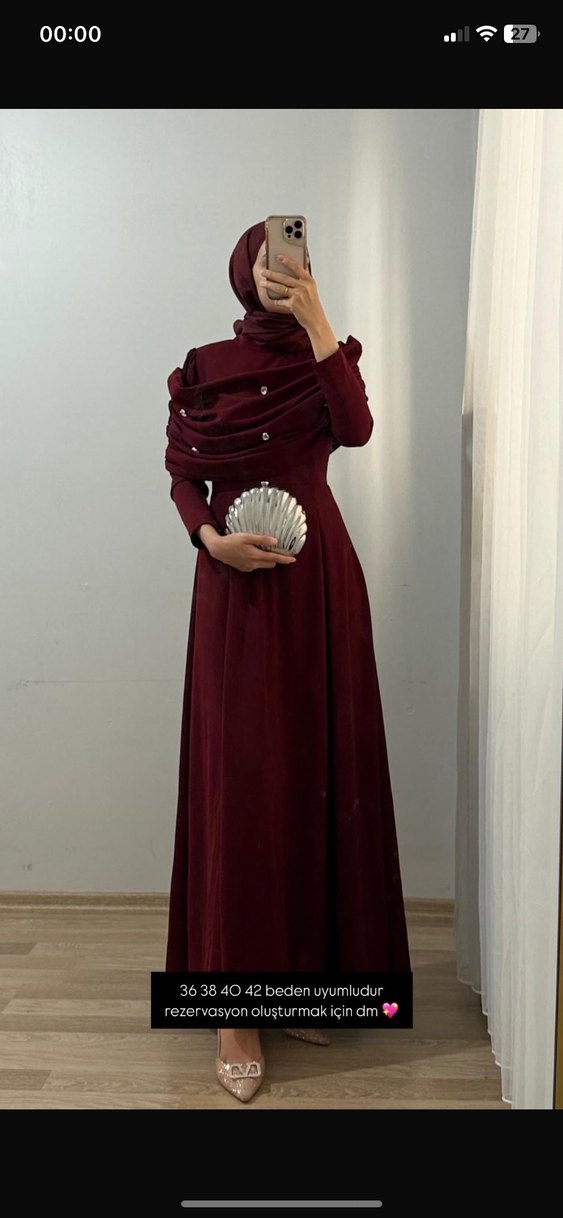 Bordo uzun elbise, yüksek yaka ve askılı kollara sahip, bol kesim ve ipeksi kumaştan, şık drapelerle süslenmiş, düğünler için uygun.