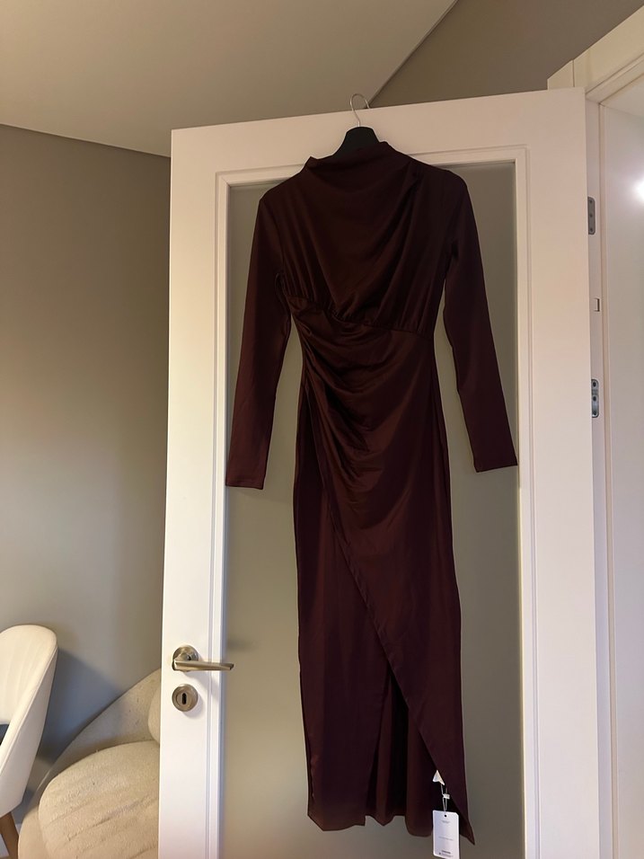 Bordo renkli, uzun kollu ve yüksek yakalı, drapeli kesime sahip, satenimsi dokulu dar kesim kadın elbisesi. Romantik akşamlar için uygundur.