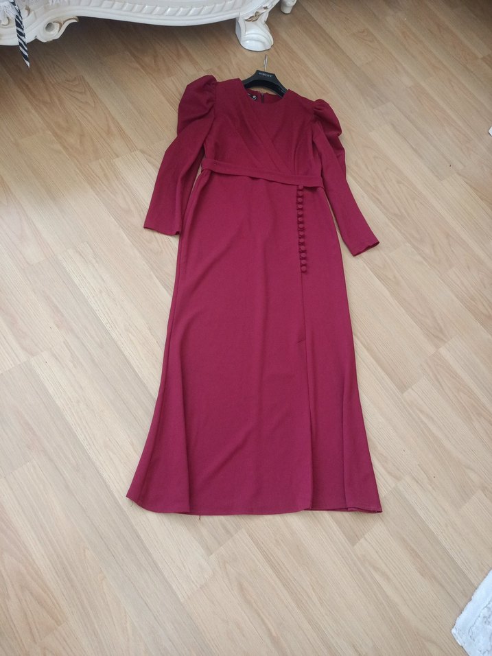 Bordo renkte, drapeli uzun elbise, V yaka ve askılı kollarla modern klasik tarzda, düzenli kesimde sentetik kumaştan.