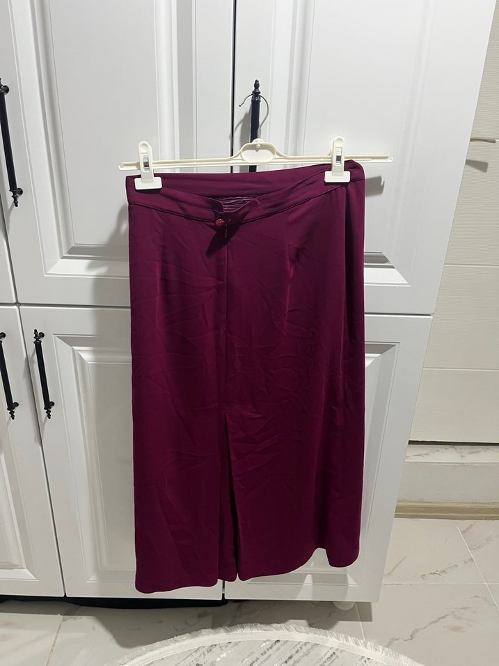 Bordo renkte, uzun ve drapeli tasarıma sahip, ince ve şık kumaştan yapılmış kadın eteği. Ofis için uygun, minimal ve modaya uygun bir modeldir.
