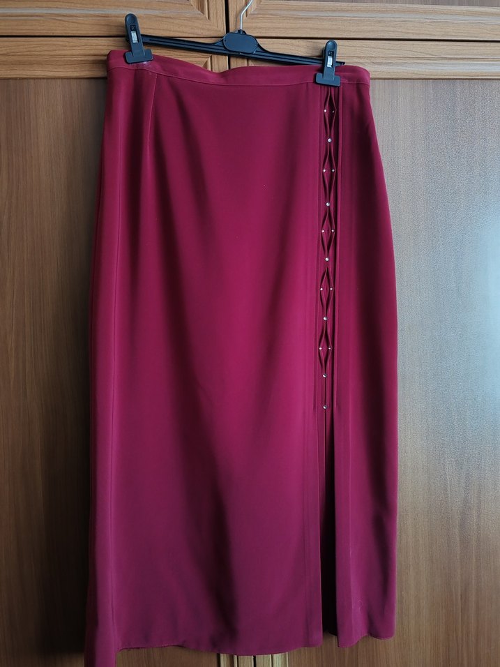 Bordo renkli, uzun kesim, drapeli detaylı ve hafif parlak dokulu kadın eteği, rahat kesimiyle ofis için uygundur. bel 90, boy 98 cm