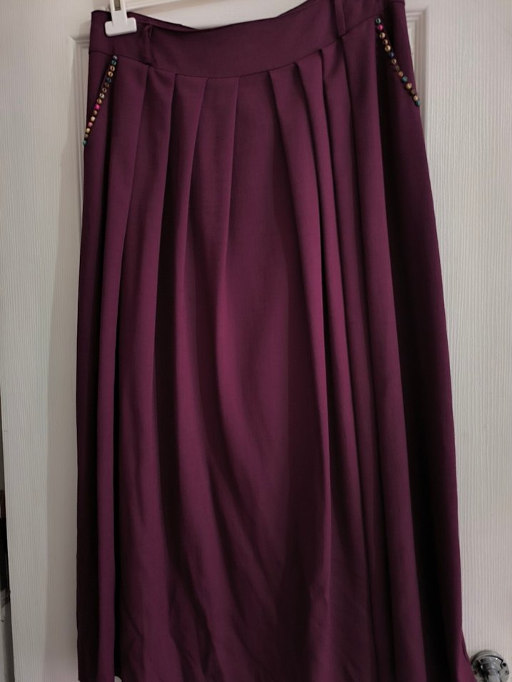 Bordo renkli, uzun, drapeli ve bol kesim kadın etek. Satenimsi dokusu ve desen içermemesiyle ofis için uygundur. Avant-garde goth tarzını yansıtır. ✨