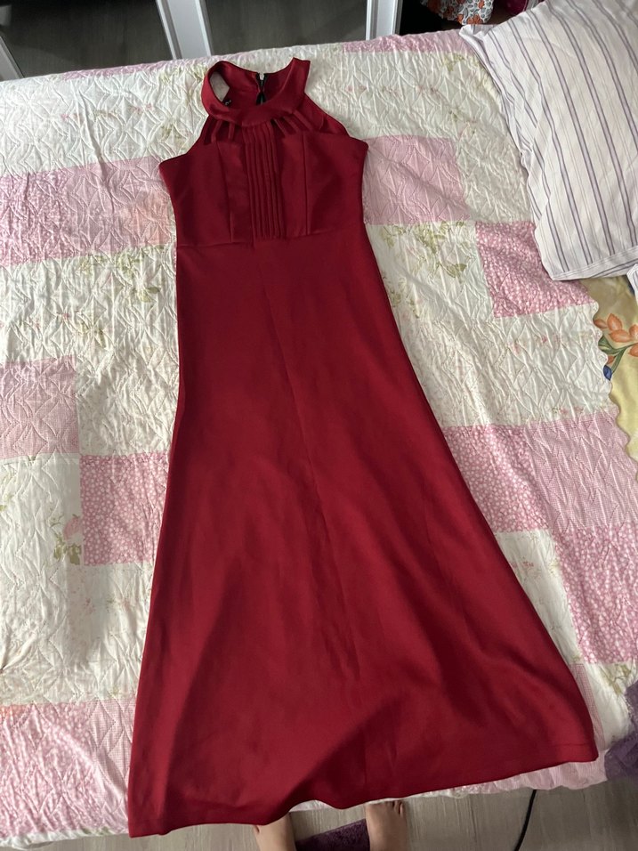 Bordo renkli, yüksek yakalı ve kolsuz uzun elbise, drapeli detayları ve vücuda oturan kesimiyle klasik ve vintage tarzına uygundur. 42 bedendir kımaşı esnektir fermuarı yok arkada kısa bir fermuarı var