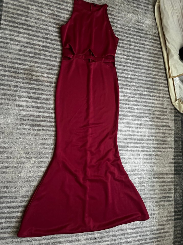 Bordo renk, uzun ve kolsuz bu abiye elbise, yüksek yakalı ve drapeli detaylara sahiptir. Romantik akşamlar için şık ve modern tasarım. 1 kere giyildi