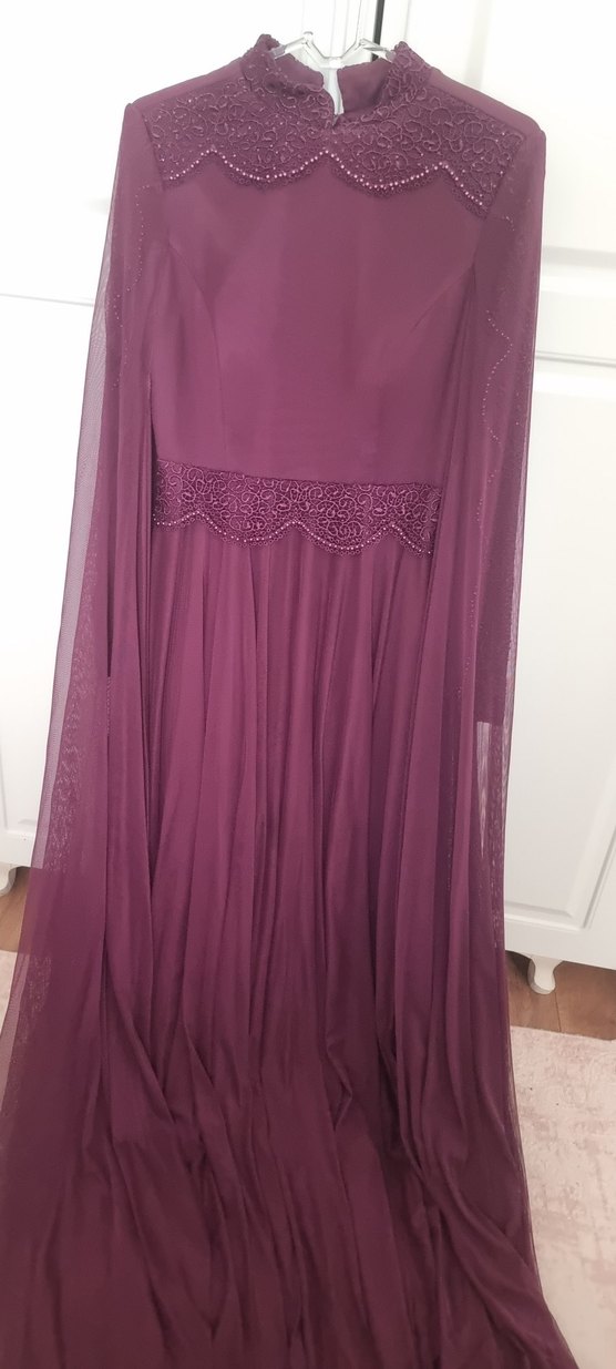 Bordo uzun drapeli nişan elbisesi, tek renk ve salaş kesimdir. Kayık yaka ve ince askılarla modern klasik ve bohem tarzı yansıtır. Bel kısmında dantel detay bulunur.