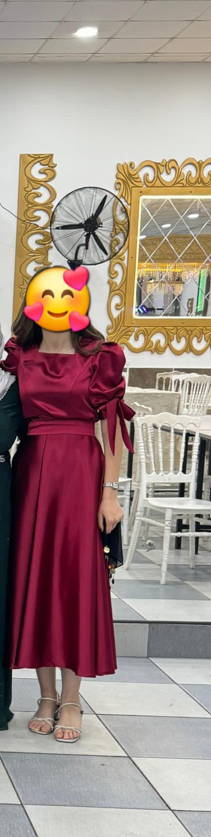 sadece bir defa giyilmiş bordo renkli, drapeli ve tek desensiz, tekne yaka, bağcıklı askılı, klasik şıklıkta, uzun ve vücuda oturan elbise.