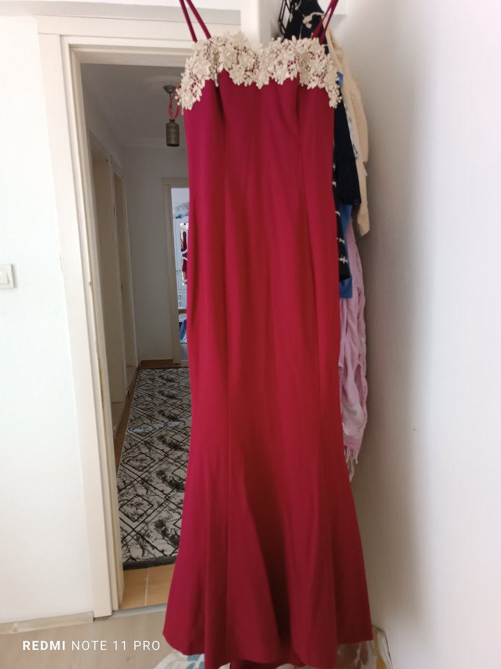 Bordo renkte, drapeli ve straplez yakalı, uzun boy ve kolsuz tasarıma sahip, klasik ve modern çizgide abiye elbise. Dantel detaylı bustiyer kısmı şık duruyor.