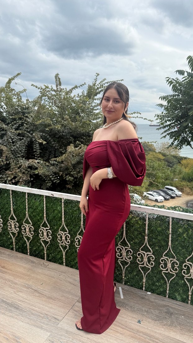 Bu bordo uzun abiye elbise, straplez yaka, drapeli detaylar ve askılı kollara sahiptir. Düğünler için uygundur ve parlak, desensiz kumaşıyla modern klasik şıklık sunar. Bir kez giydim