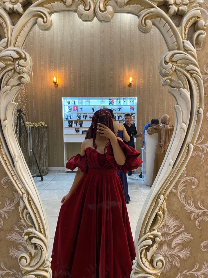 Bordo uzun boy drapeli straplez, ince askılı ve parlak kumaştan kadın abiyesi. Gevşek kesimiyle modern klasik ve gotik tarzda düğünler için uygun.