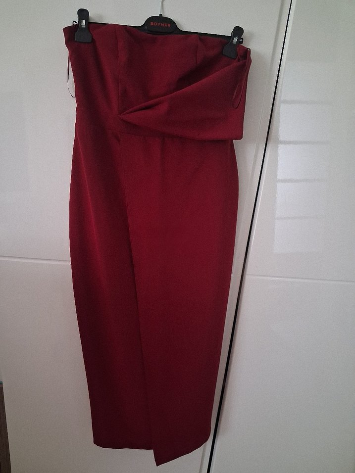 Bordo renkte, straplez ve drapeli tasarıma sahip, uzun ve vücuda oturan kalem elbise. İnce ve parlak dokusu romantik akşamlar için ideal. Modern ve minimal tarzda, kolsuz.