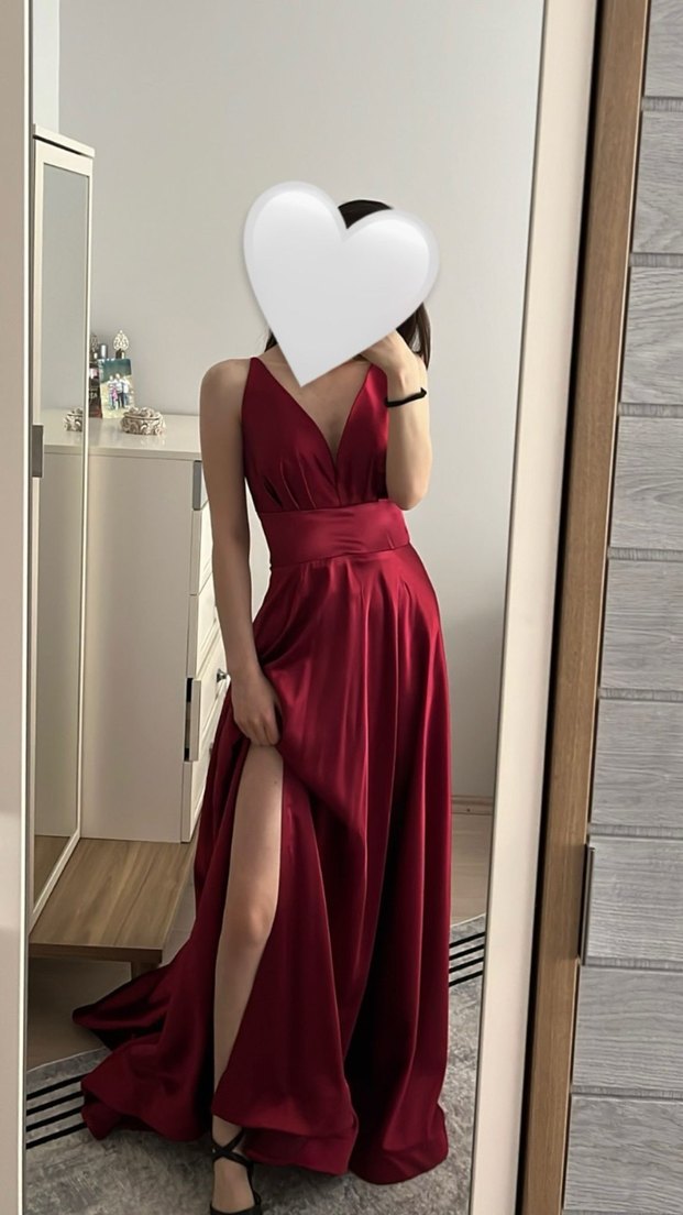 Bordo renkli, derin V yakalı ve drapeli detaylara sahip, askılı kollu ve parlak görünümlü, fit kesim uzun abiye elbise. Sadece 1 defa giyildi hiç bir kusuru yoktur.