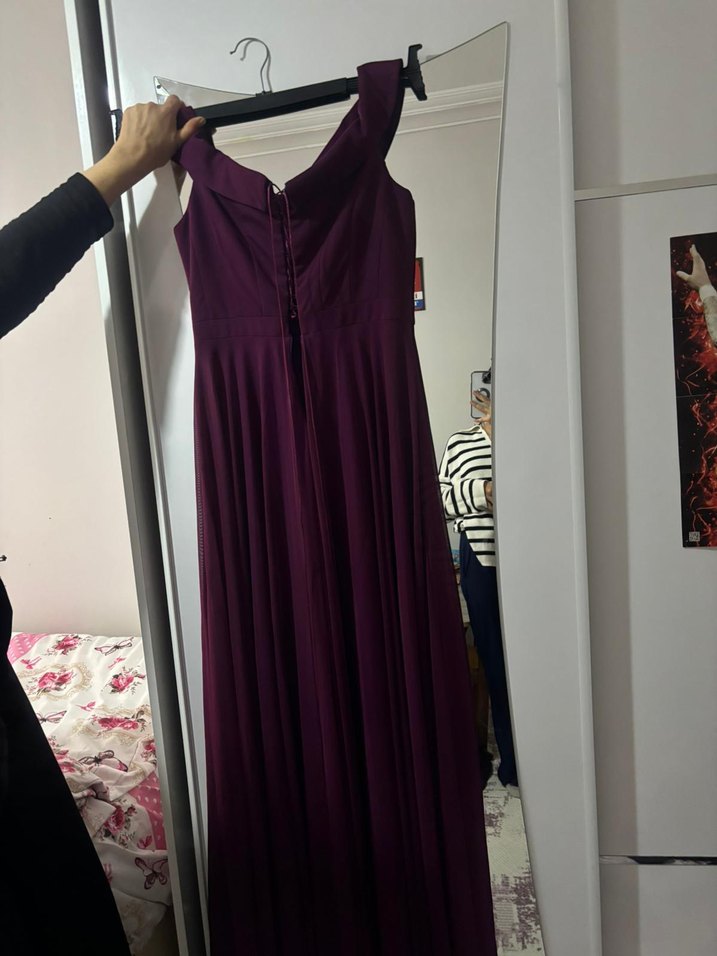 fuşya renginde , drapeli ve V yakalı, kolsuz ve uzun . Düğün ve minimalist tarz için uygundur.
