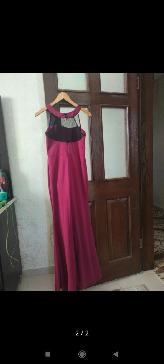 Bordo renkte, uzun ve v yakalı, drapeli, kolsuz, klasik ve minimal tarzda, düğünler için uygun dar kesim abiye elbise.