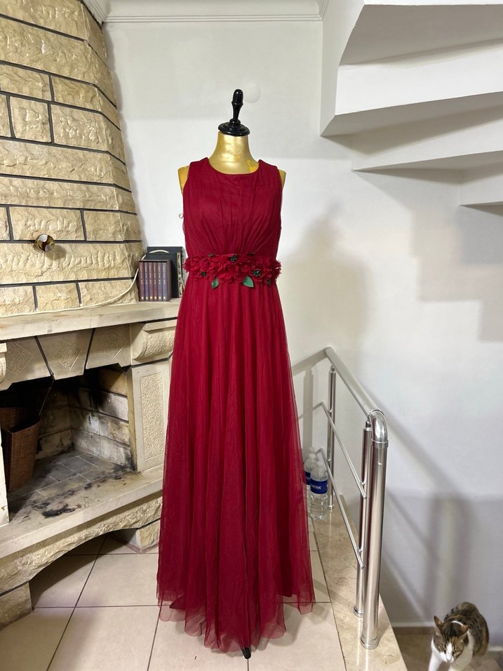 Bordo uzun abiye elbise, kolsuz ve drapeli tasarıma sahip. Renkli işlemelerle süslenmiş, straplez yakalı ve düzenli kesimdir. Düğün ve vintage tarzı için uygundur. 34-36-38 bedenler için uygundur.