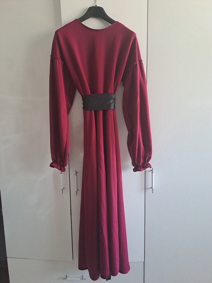 Bu koyu bordo uzun elbise, bol kesim ve drappeli detaylara sahip. Yuvarlak yaka ve bilekte büzgülü uzun kolludur, yumuşak sentetik kumaştan yapılmıştır.