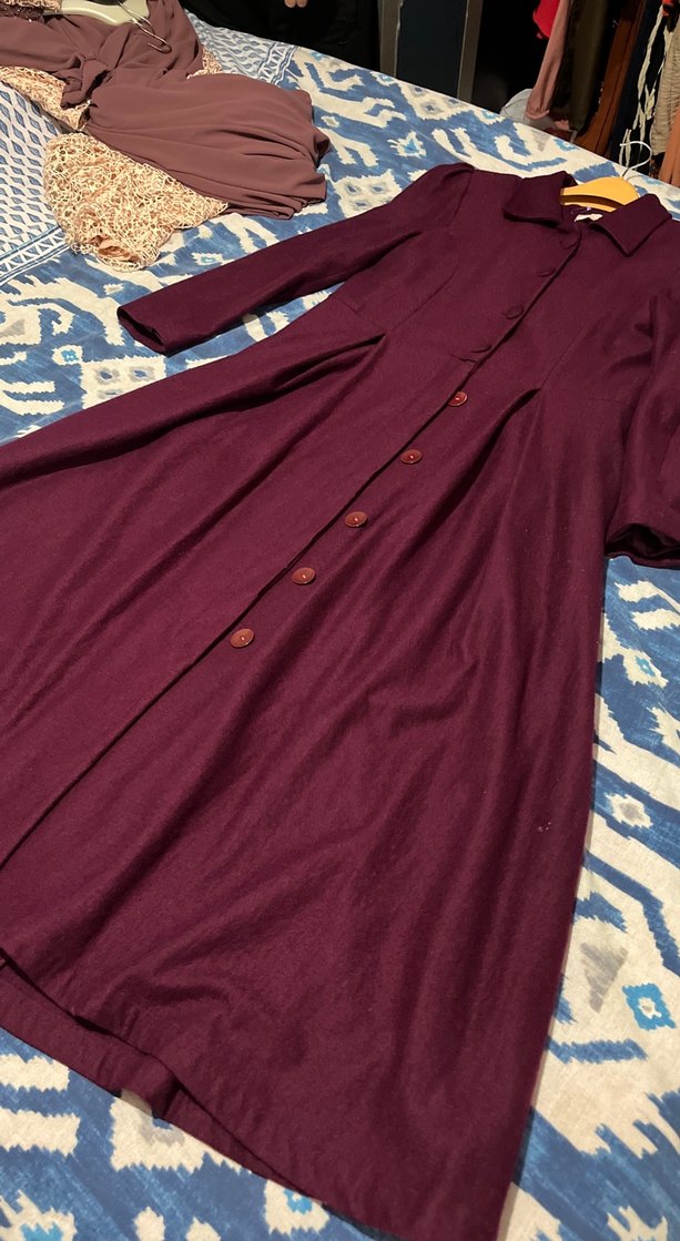 Bordo renkli, uzun ve düğmeli hamile kabanı, notched lapel yakalı ve uzun kolludur. Sentetik kumaştan, bol kesimdir, günlük kullanıma uygundur.
