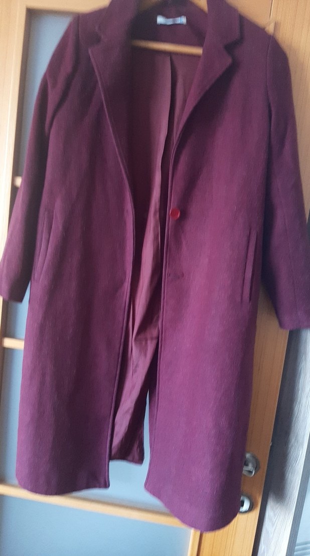 Bordo renkli, uzun kesim, düğmeli kabanı. Notched lapel yakalı, uzun kollu ve rahat kesimdir. Ofis kullanımı için uygundur.