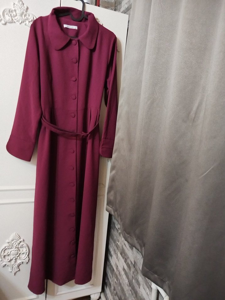 Bordo renkte, uzun boy, düğmeli, kemerli ve klasik kesim kadın kaban. Notlu yakalı, düz ve sentetik kumaştan, ofis için uygun şık tasarım.