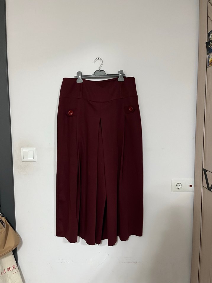 Bordo renkli, düğmeli ve bol kesim uzun etek. Yumuşak ve ipeksi dokusuyla minimalist, ofis şıklığı için uygun.