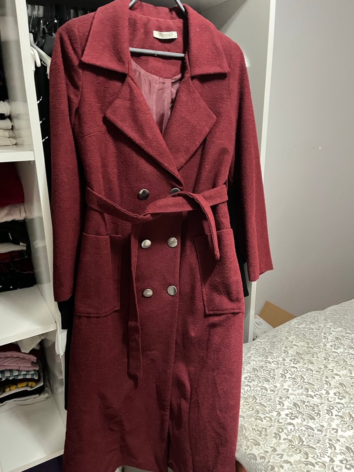 Bordo renkli, düğmeli ve kemerli uzun kadın kabanı, yumuşak ve sıcak kumaştan üretilmiştir. Notched lapel yaka ve uzun kolludur, ofis için idealdir.