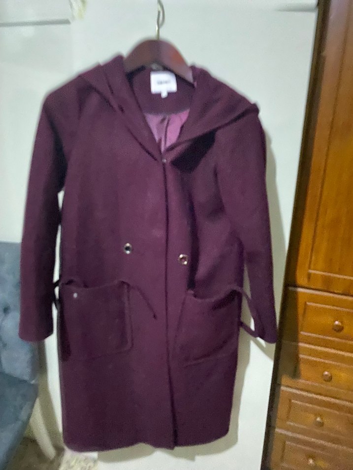 Bordo uzun kaban, düğmeli ve yakalıdır. Yumuşak, rahat kumaştan üretilmiş, uzun kollu ve geniş ceplidir. Günlük sokak tarzına uygundur.