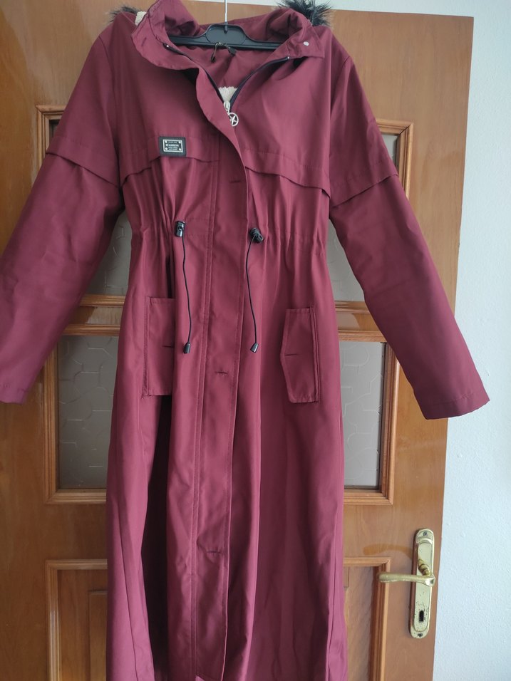 Bordo renkli, uzun ve fermuar kadın kaban. mont ve uzun kollu, bol kesim, yumuşak ve sıcak kumaştan üretilmiştir. Sokak stiline uygun.