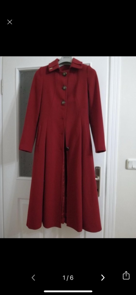 Kadınlar için bordo uzun kaban, düğmeli ve kesik yaka detaylıdır. Uzun kollu, rahat kesimdir ve yumuşak, sıcak dokudadır. Modern klasik tarzı ofis için uygundur.
